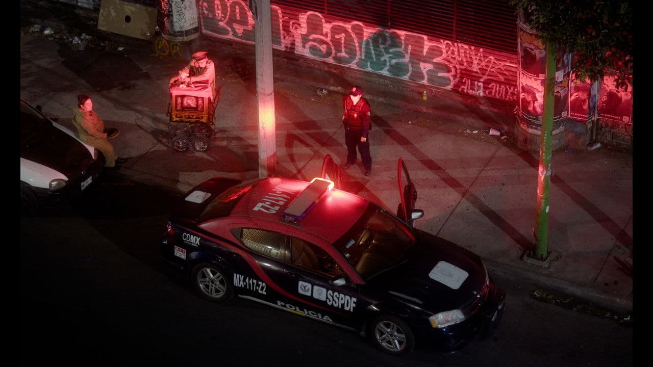 Two barrel organ players roam the streets of Juárez, a district of Mexico City. They play their music and ask passers-by for money, while a couple of tourists from Paris set up an insurance fraud...